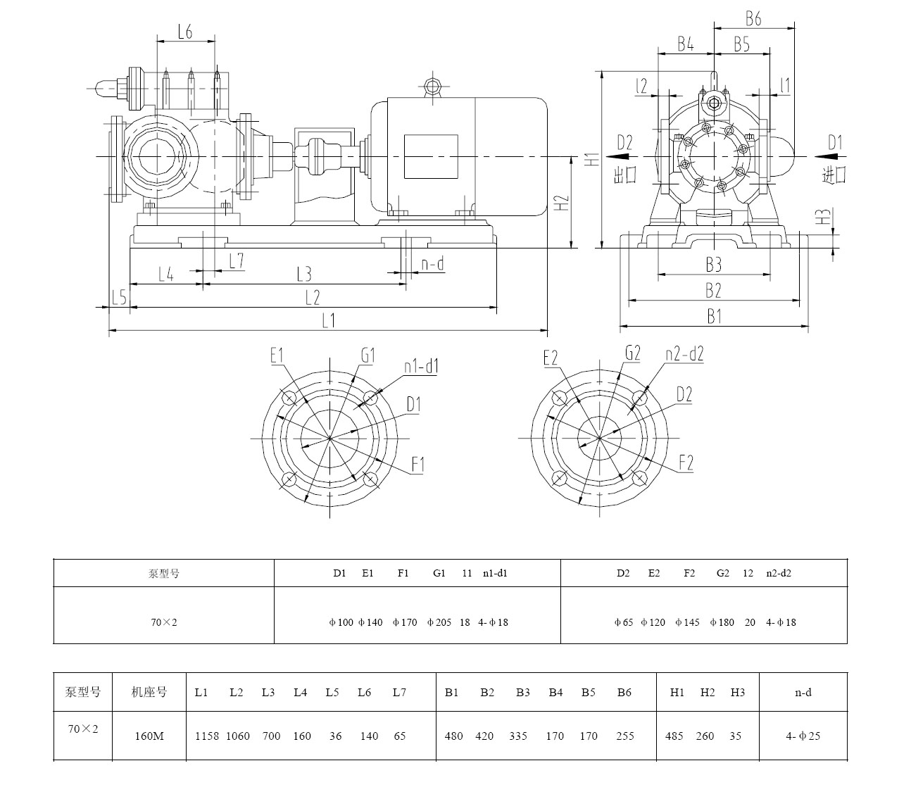 3GR70*2W2三螺杆泵(beng)配7.5KW-4電機尺寸圖(tu),該三螺杆泵流(liú)量24m3/h,壓力0.6Mpa,吸入真(zhen)空高度4.5米,進口(kou)100米,出口65米.